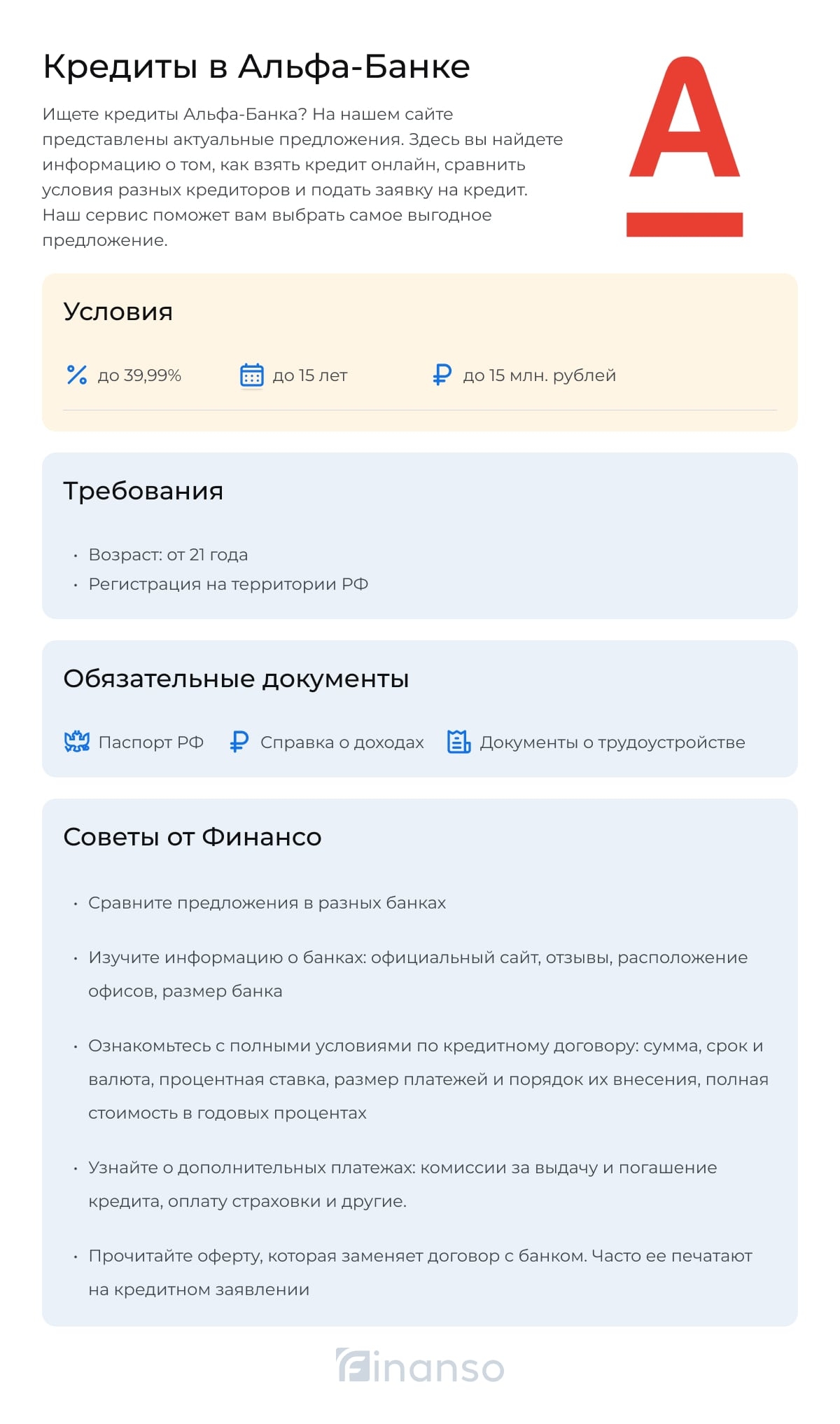 На этой странице предоставлена полная информация о кредитовании в Альфа-Банке. Здесь можно узнать требования и условия, сравнить ставки по кредитам и прочитать отзывы клиентов, а также подать онлайн-заявку.