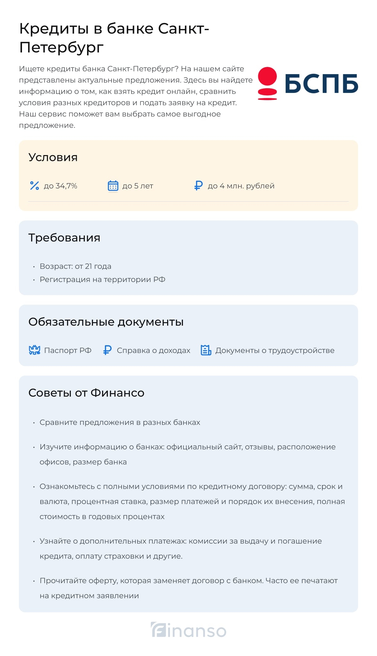 На этой странице предоставлена полная информация о кредитовании в банке Санкт-Петербург. Здесь можно узнать требования и условия, сравнить ставки по кредитам и прочитать отзывы клиентов, а также подать онлайн-заявку.