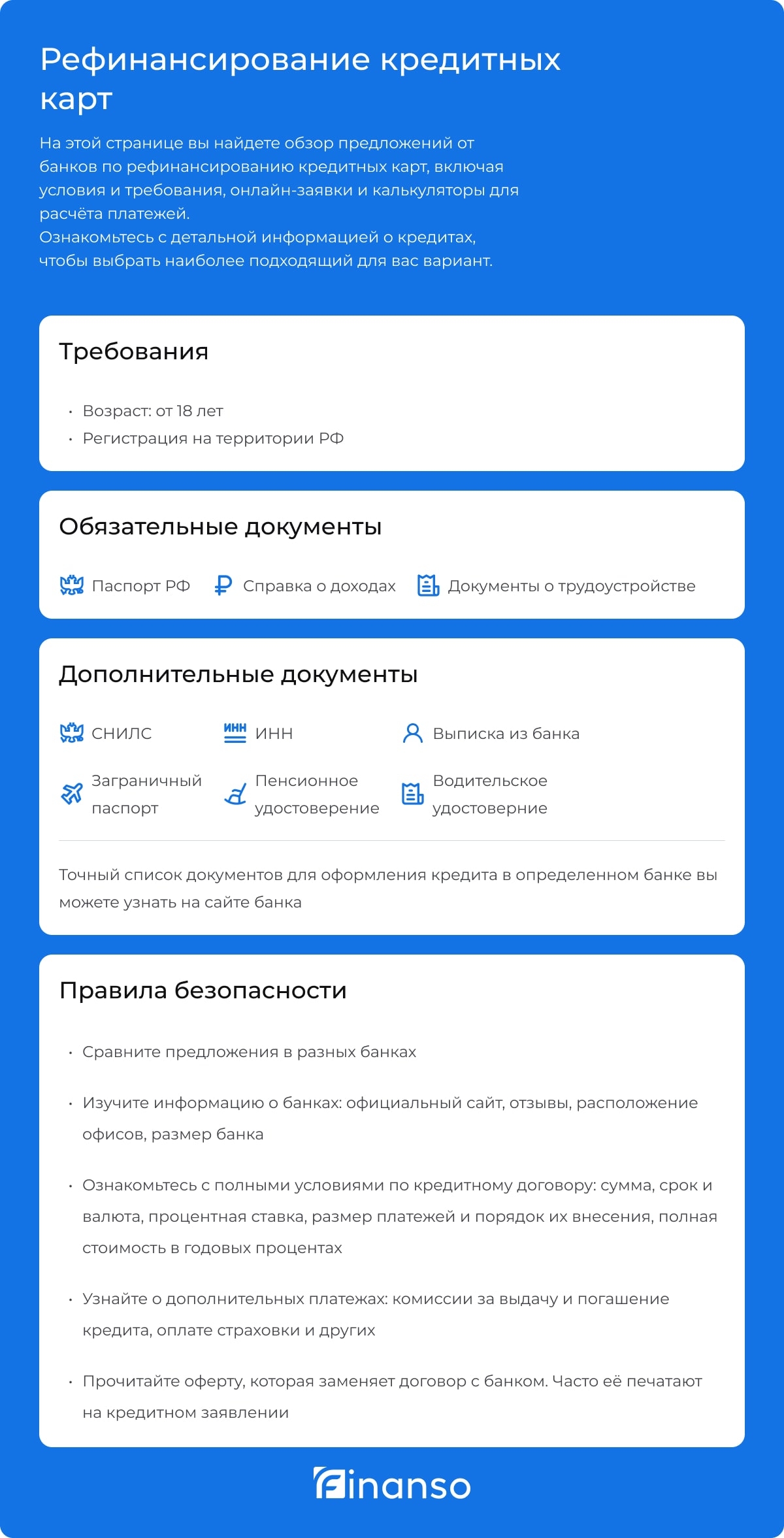 Рефинансирование кредитных карт позволяет заменить задолженность по одной или нескольким картам новым продуктом. Это может быть потребительский кредит или кредитная карта с более выгодными условиями и специальным льготным периодом для погашения задолженностей перед другими банками. Заявка подаётся онлайн: нужно указать данные по текущим долгам, прикрепить паспорт и подтвердить доход. После одобрения банк переводит средства заёмщику, а тот самостоятельно гасит задолженность по действующим картам.