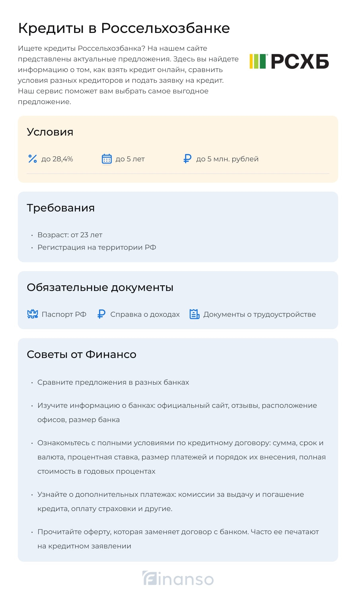 На этой странице предоставлена полная информация о кредитовании в Россельхозбанке. Здесь можно узнать требования и условия, сравнить ставки по кредитам и прочитать отзывы клиентов, а также подать онлайн-заявку.