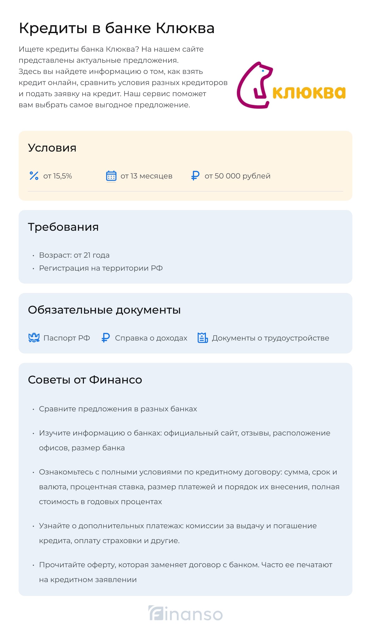 На этой странице предоставлена полная информация о кредитовании в банке Клюква. Здесь можно узнать требования и условия, сравнить ставки по кредитам и прочитать отзывы клиентов, а также подать онлайн-заявку.