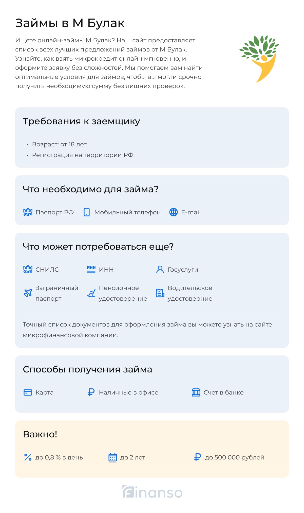 Подать заявку в М Булак можно дистанционно, компания не выдает деньги онлайн через сайт, но принимает предварительные обращения и консультирует удаленно. Быстрее всего оформить обращение через мобильное приложение М Булак, где можно оставить заявку и прикрепить документы. Также заявки принимают по телефону горячей линии.