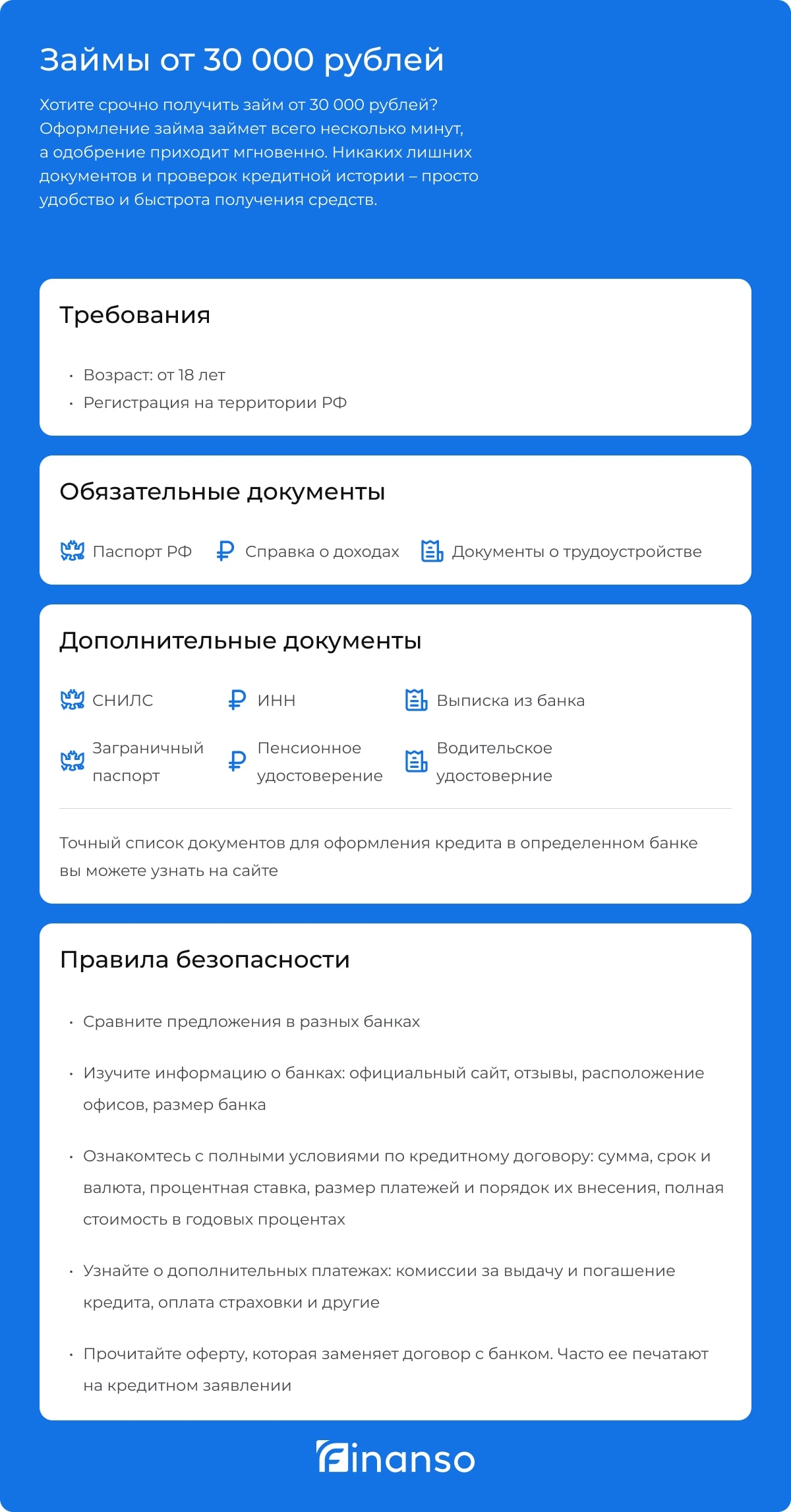 Займы на 30 000 рублей являются максимальными по размеру в сегменте небольших сумм. В рамках классификации такие предложения всё ещё входят в категорию мини-займов, подчиняясь общим правилам займа.